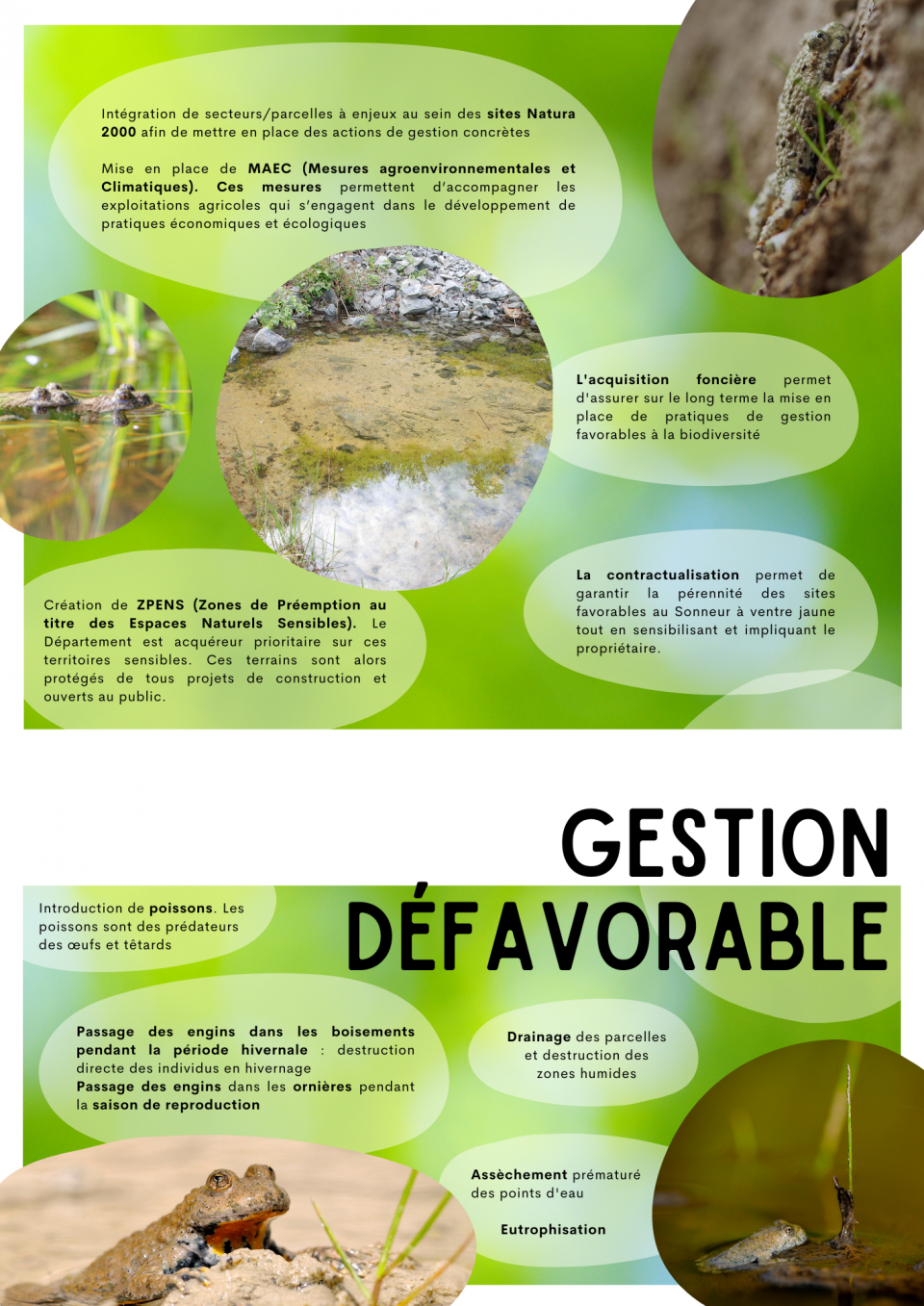 Le Sonneur à ventre jaune est intégralement protégé en France depuis 1976 et en Europe depuis 1979 (Convention de Berne). L’Europe et la France travaillent ensemble pour conserver cette espèce au travers d’outils comme la Directive Habitats-Faune-Flore de 1992 et de Plans Nationaux d’Actions. Le GMHL anime le Plan Régional d’Actions pour le Sonneur à ventre jaune à l’échelle du Limousin, en collaboration avec la DREAL Nouvelle-Aquitaine.